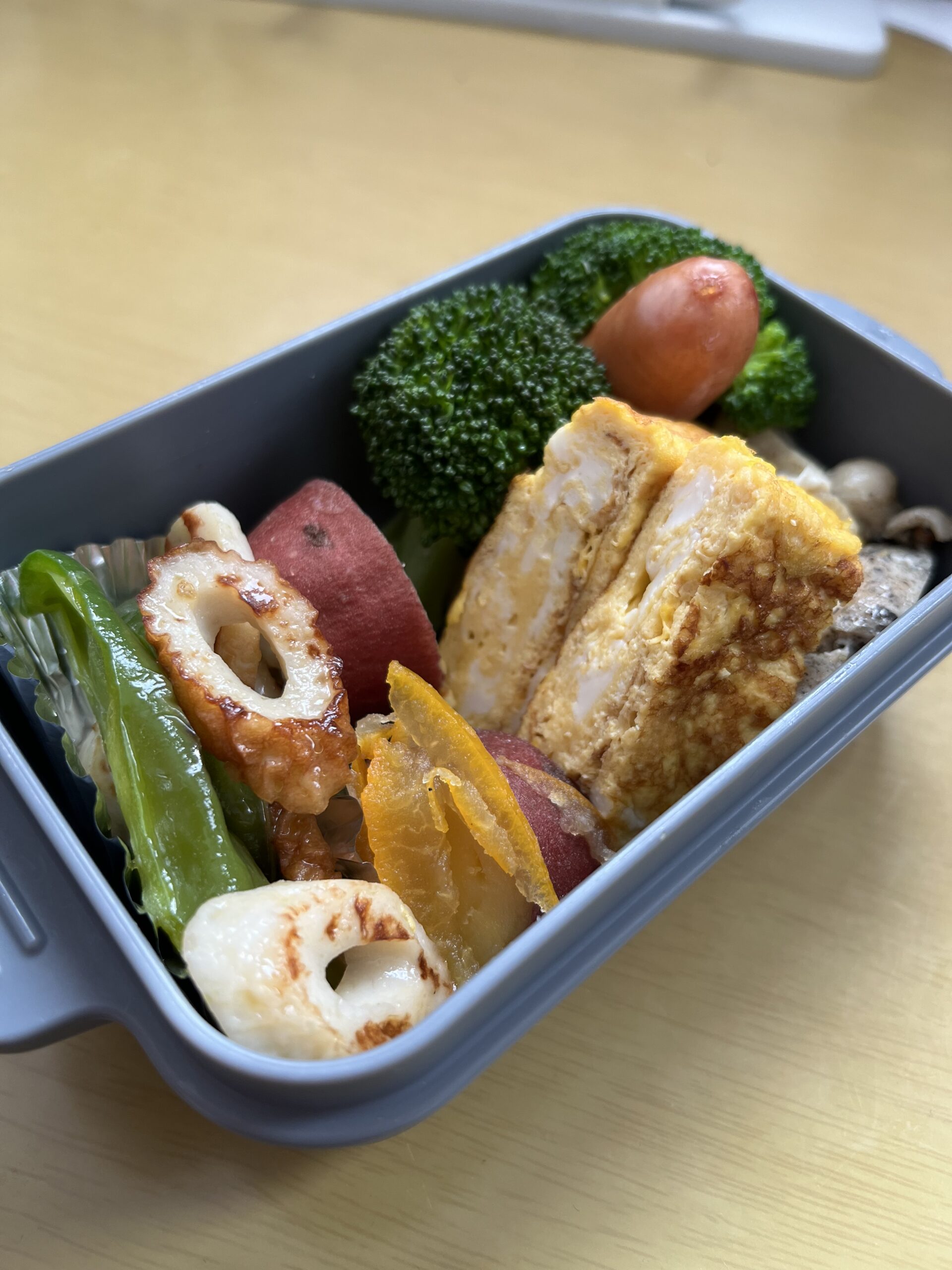 作り置きを色々入れたら、盛りだくさんになってしまいました。